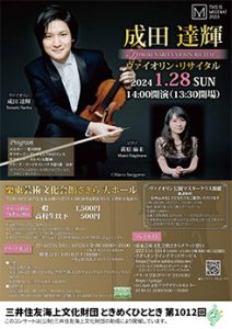 本日1月28日(日)14:00開演「三井住友海上文化財団 ときめくひととき 第1012回 成田達輝ヴァイオリン・リサイタル」は10:00より1階事務所にて当日券を販売いたします。