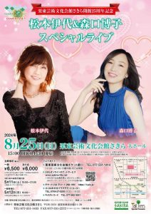 本日8月25日(日)15:00開演「松本伊代&森口博子スペシャルライブ」は10:00より1階事務所にて当日券を販売いたします。