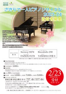 「さきらで一人ピアノリサイタル2023-24」の登録者募集は定員に達しましたので終了いたしました。多数のご応募、誠にありがとうございました。